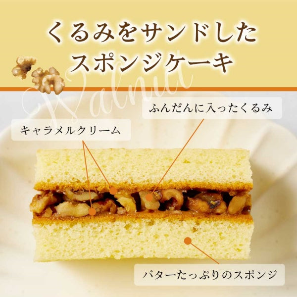 くるみのすき間ご覧頂けますか。すき間って「空気」です。この空気加減が味をつくっています。バターの風味豊かなスポンジで、ローストしたくるみとキャラメルクリームをサンドしました。