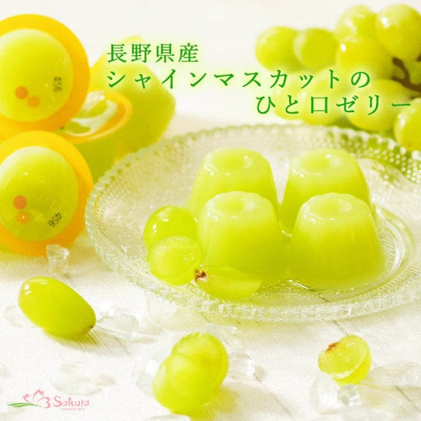 長野県の恵み、シャインマスカットを使用した一口ゼリーです。甘くて爽やかな風味が特徴であり、口の中で広がる芳醇な味わいをお楽しみいただけます。シャインマスカットの甘さと香りをそのままに、贅沢な一品としてお届けします。
