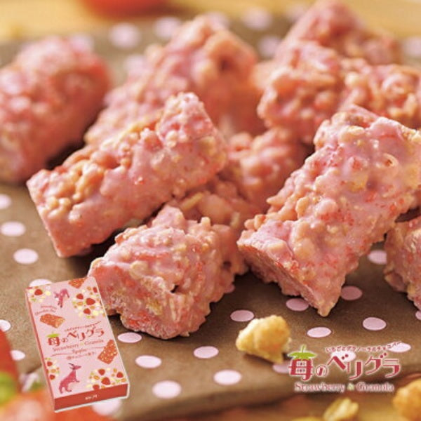 [Raw materials] 準チョコレート(砂糖、植物油脂、全粉乳、乳糖、ココアバター、デキストリン)、グラノラ{全粒オーツ麦、砂糖、米シリアルパフ(米粉、小麦粉、砂糖、麦芽粉、食塩)、植物油脂、砂糖、シリアルパフ(コーンフラワー、小麦粉、米粉、砂糖、食塩)、オーツ粉、ココナッツパウダー、オーツ麦パフ、糖蜜、水あめ、麦芽エキス、小麦でん粉、食塩、はちみつ、キャラメル}、乾燥果実加工品(砂糖、でん粉、デキストリン、水あめ、苺、苺濃縮果汁)、苺粉末/赤ビート色素、酸味料、香料、乳化剤、膨張剤、酸化防止剤(V.E)、(原材料の一部に乳成分・小麦・大豆を含む)