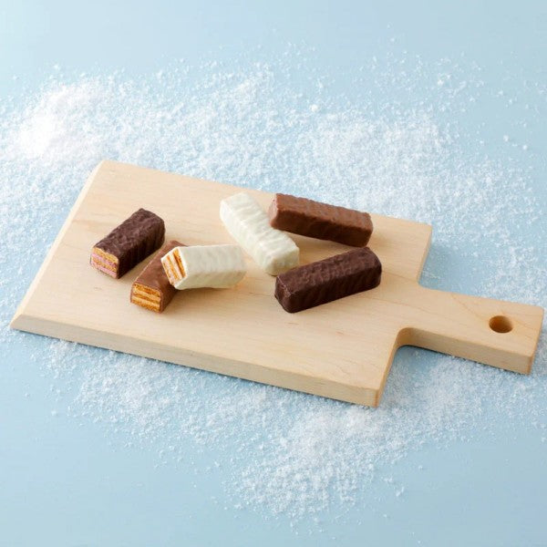 その間に、ブルーベリー・キャラメル・マロンの3つのフィリングをサンドし、それぞれに合わせたチョコレートでコーティングしました。サクッとおいしいハーモニーをお楽しみください。