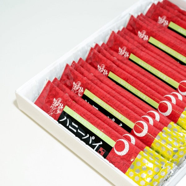 おいしい日本独自のお菓子。甘くてフレーク状のハニーパイに伝統的なうなぎの粉末を混ぜ合わせました。美しい黄金色でうなぎの形をしたこれらのお菓子は、日本を代表する生き物の 1 つを祝うおいしい方法です。家族や友人へのプレゼントに最適な絶妙なギフトボックスに包まれています。