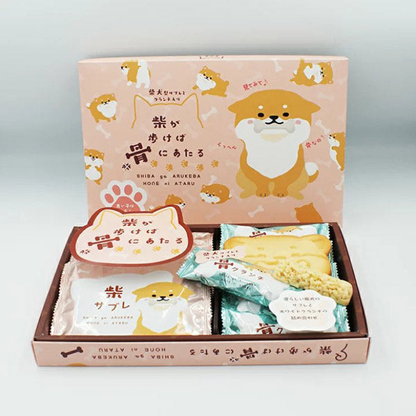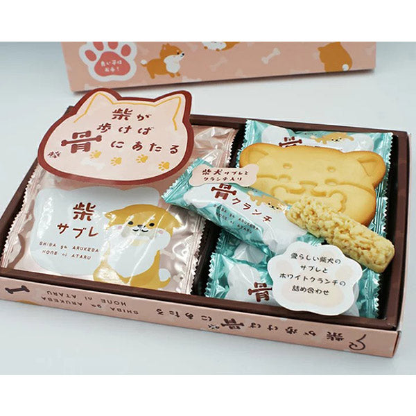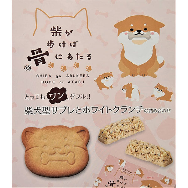 「柴が歩けば骨にあたる」の詰め合わせには、愛らしい柴犬のサブレと 骨型のホワイトクランチが入ってます