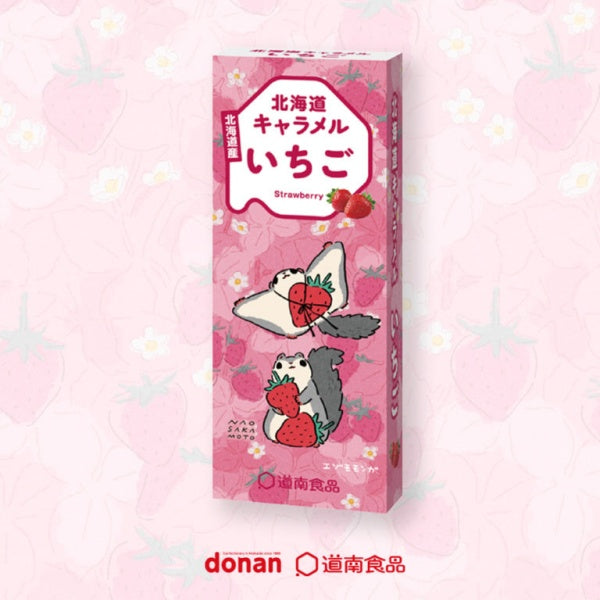「北海道キャラメル いちご」は、北海道産いちごのパウダーを使用した、爽やかないちごが香るキャラメルです。北海道にこだわったパッケージには、北海道素材のおいしさと北海道に住む可愛らしい動物である「エゾモモンガ」が北海道育ち北海道在住のイラストレーター坂本奈緒さんによって描かれています。