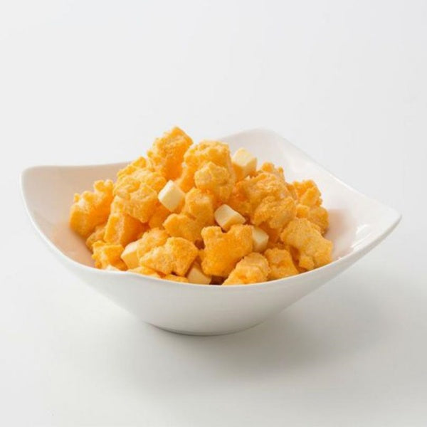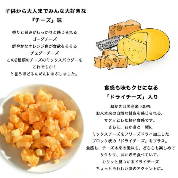 [Raw materials] 水稲もち米(国産)、植物油脂、プロセスチーズ、チーズ風味シーズニング、スイートコーンパウダー、チーズパウダー、食塩、粉末小麦発酵調味料/調味料(アミノ酸等)、香料、パプリカ色素、(一部にえび・小麦・乳成分・大豆を含む)