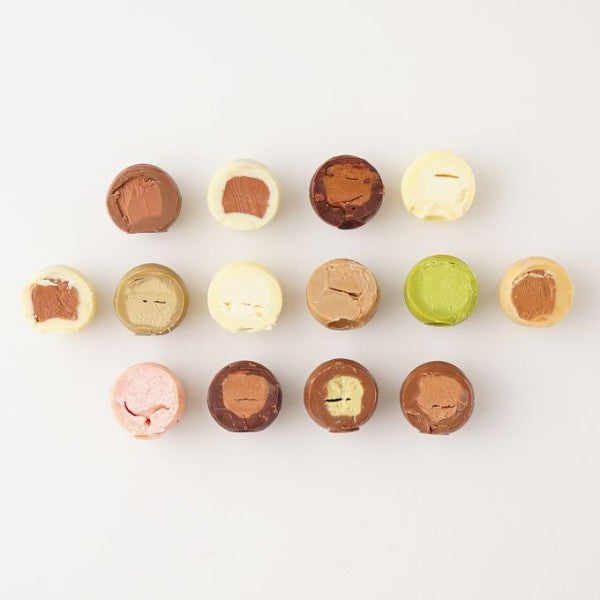 14個入(ダーク、ミルク、ホワイト、ストロベリー、抹茶、ヘーゼルナッツ、チョコバナナ、チョコミント、オレンジ、キャラメル、カフェラテ、ほうじ茶、ゆず、ピスタチオ、各1個ずつ)