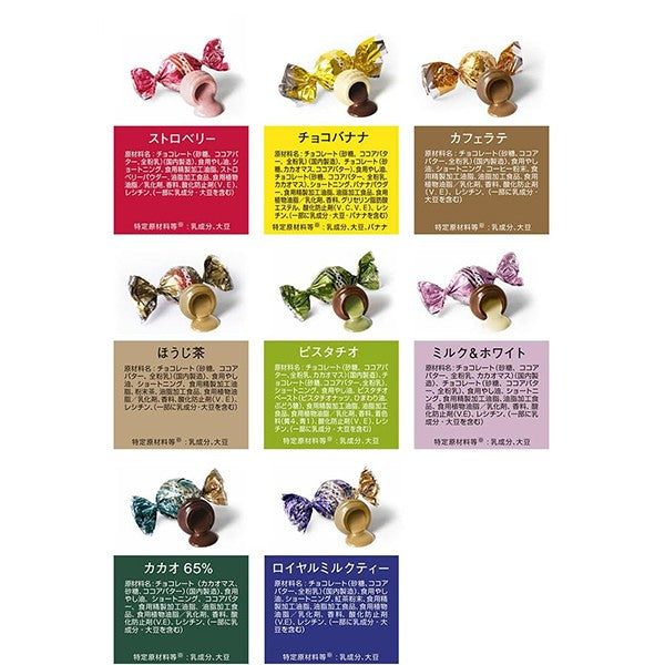 [Raw materials] 【ホワイト】チョコレート(砂糖、ココアバター、全粉乳)(国内製造)、食用やし油、ショートニング、食用精製加工油脂、油脂加工食品、食用植物油脂/乳化剤、香料、酸化防止剤(V.E)、レシチン、(一部に乳成分、大豆を含む) 【ヘーゼルナッツ】チョコレート(砂糖、カカオマス、ココアバター)(国内製造)、チョコレート(砂糖、ココアバター、全粉乳、カカオマス)、ヘーゼルナッツ加工品(ヘーゼルナッツ、砂糖)、ショートニング、食用やし油、食用精製加工油脂、油脂加工食品、食用植物油脂/乳化剤、香料、酸化防止剤(V.E)、レシチン、(一部に乳成分、アーモンド、大豆を含む) 【オレンジ】チョコレート(砂糖、ココアバター、全粉乳、カカオマス)(国内製造)、チョコレート(砂糖、カカオマス、ココアバター)、食用やし油、ショートニング、オレンジ果汁パウダー、食用精製加工油脂、油脂加工食品、食用植物油脂/乳化剤、香料、酸化防止剤(V.E)、レシチン、(一部に乳成分、オレンジ、大豆を含む) 【キャラメル】チョコレート(砂糖、ココアバター、全粉乳)(国内製造)、チョコレート(砂糖、ココアバター、全粉乳、カカオマス)、食用やし油、ショートニング、キャラメルパウダー(濃縮乳、水あめ、脱脂粉乳)、食用精製加工油脂、油脂加工食品、食用植物油脂/乳化剤、香料、酸化防止剤(V.E)、レシチン、(一部に乳成分、大豆を含む) 【ソルティミルク】チョコレート(砂糖、ココアバター、全粉乳、カカオマス)(国内製造)、食用やし油、ショートニング、食用精製加工油脂、食塩、油脂加工食品、食用植物油脂/乳化剤、香料、リン酸三カルシウム、酸化防止剤(V.E)、レシチン、(一部に乳成分、大豆を含む) 【ダーク&ミルク】チョコレート(砂糖、カカオマス、ココアバター)(国内製造)、チョコレート(砂糖、ココアバター、全粉乳、カカオマス)、食用やし油、ショートニング、食用精製加工油脂、油脂加工食品、食用植物油脂/乳化剤、香料、酸化防止剤(V.E)、レシチン、(一部に乳成分、大豆を含む) 【ココナッツ】チョコレート(砂糖、ココアバター、全粉乳、カカオマス)(国内製造)、チョコレート(砂糖、ココアバター、全粉乳)、食用やし油、ショートニング、ココナッツミルクパウダー、食用精製加工油脂、油脂加工食品、食用植物油脂/乳化剤、香料、カゼインNa、酸化防止剤(V.E)、レシチン、(一部に乳成分、大豆を含む) 【黒糖きなこ】チョコレート(砂糖、ココアバター、全粉乳)(国内製造)、食用やし油、ショートニング、食用精製加工油脂、黒糖、きな粉、油脂加工食品、食用植物油脂/乳化剤、香料、酸化防止剤(V.E)、レシチン、(一部に乳成分、大豆を含む)