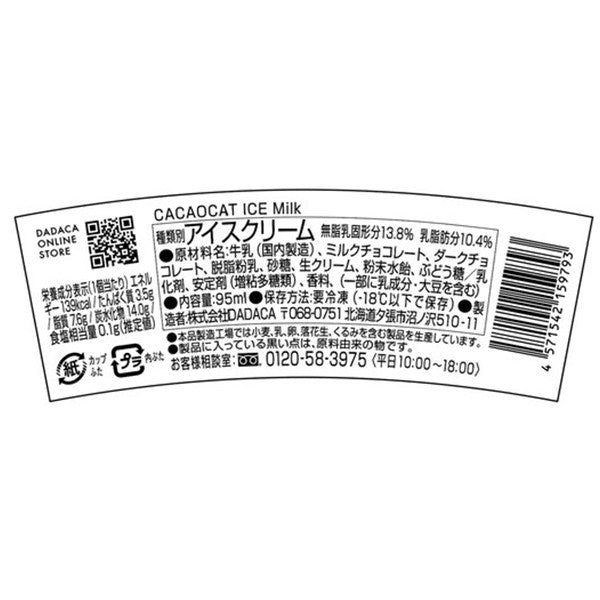 [Raw materials] 牛乳(国内製造)、ミルクチョコレート、ダークチョコレート、脱脂粉乳、砂糖、生クリーム、粉末水飴、ぶどう糖/乳化剤、安定剤(増粘多糖類)、香料、(一部に乳成分・大豆を含む)