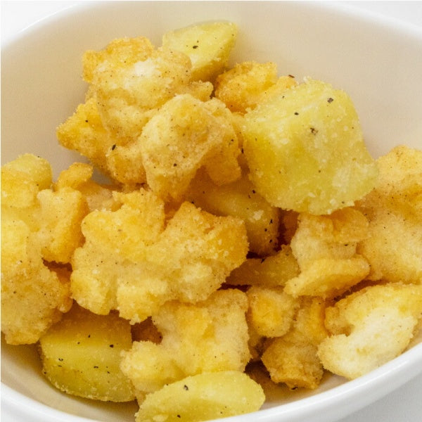 じゃがいものおいしさを凝縮させ、ほんのりスパイスをきかせた「特製ドライポテト」に国産米100%のおかきを玉ねぎの甘みで味付けしたダブルのおいしさ。